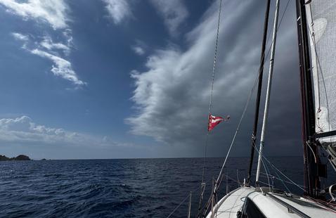 Initialement, nous visions la baie de Rondinara pour cette étape. Mais face à ces conditions portantes très favorables, nous faisons le choix de prolonger la navigation jusqu’à la baie de Pinarellu, un peu plus au nord. Cette modification de destination, prise en mer, s’appuie sur des conditions bien établies... du moins jusqu’à ce que la météo locale vienne rebattre les cartes.