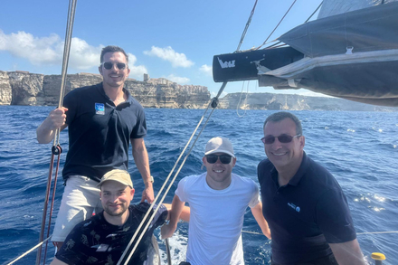 À la sortie de Bonifacio, les conditions sont conformes aux attentes : vent modéré d’ouest, mer peu agitée, ciel clair. En s’approchant des îles Lavezzi, le vent monte à 20-25 noeuds, avec une mer moutonneuse mais maniable, les vagues venant de l’arrière. Le bateau glisse parfaitement dans ces conditions idéales pour le portant.