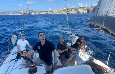 À 12 milles de Capraia, un flux d’ouest s’établit brutalement à 25 noeuds. Les vagues montent par bâbord à 2 mètres, les embruns cinglent le pont, les regards se tendent, les mains se crispent sur les filières. Séance de cramponnage générale ! Tout le monde est réveillé, trempé, rincé mais galvanisé. La mer nous rappelle sa puissance.