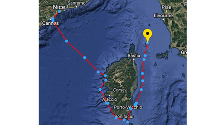 Mais après seulement deux heures de navigation, le tableau se fige : entrée brutale dans une large zone de molle le long de la Costa Serena, où les vents s’évanouissent complètement. Pendant que le sud-ouest souffle au large, nous faisons le choix de traverser cette zone au plus court, pour aller chercher la rotation à l’ouest plus au nord, à hauteur de Bastia.