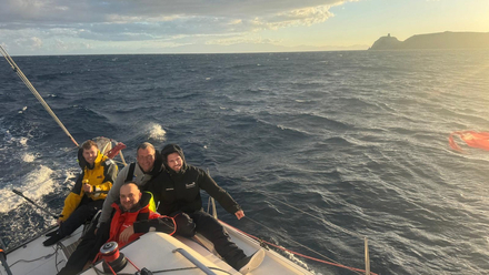 Départ rapide, sous un beau vent d’ouest à 15-20 noeuds, bien modélisé et parfaitement exploité : le bateau file à 10 noeuds au portant, les sourires sont là, le rythme est lancé.