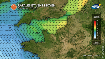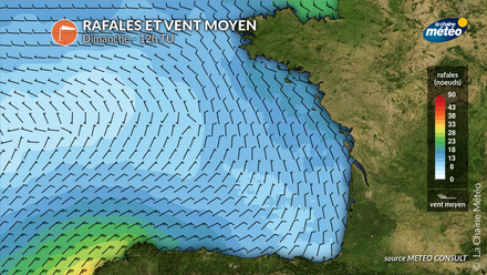 En mer : dimanche, les conditions de vent et de mer s’améliorent en bordure de l’anticyclone des Açores. Le vent s’oriente au nord-ouest et souffle modérément. La mer redevient peu agitée le long de la côte.