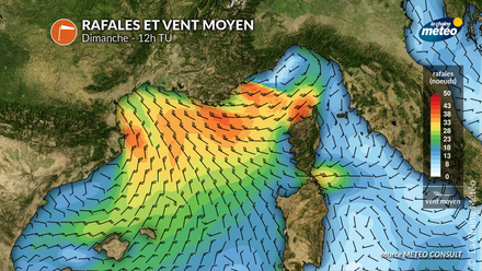 En mer : mistral et tramontane se lèvent et soufflent toute la journée de dimanche avec des rafales pouvant atteindre 35 à 40 noeuds au large de la Provence. Le vent d’ouest à sud-ouest souffle fort sur les extrémités nord et sud de la Corse. Les conditions de mer se dégradent dimanche sur les secteurs exposés au vent fort.