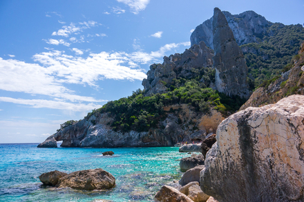 Ce qui frappe en premier lieu à Cala Goloritzé, c’est la verticalité du paysage. Une aiguille calcaire de 143 mètres, le Monte Caroddi, s’élève avec une élégance austère juste derrière la plage. Cette formation géologique, née d’un glissement de terrain dans les années 1960, attire aujourd’hui les grimpeurs du monde entier. Sa silhouette effilée évoque un clocher ou une flèche gothique, comme si la nature elle-même avait dressé un monument au-dessus de la mer.