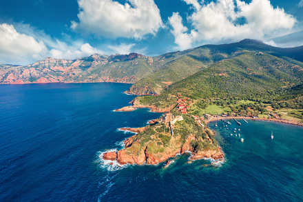 En approchant par la mer, on longe une côte fascinante, sculptée par les éléments. Roches rouges, criques secrètes, surplombs vertigineux : chaque mille est un tableau mouvant. Puis l’on devine les contours de la baie, sa plage principale, ses quelques maisons au toit de tuile, et le fortin génois qui domine le tout, vestige du XVIe siècle.