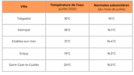 Température de l'eau pour les Côtes d’Armor : aux alentours de 18,8 degrés en moyenne pour ce mois de juillet, supérieures à la moyenne des normales saisonnières de 16,3°C.