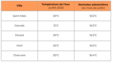 Température de l'eau pour l’Ille-et-Vilaine : aux alentours de 20,2 degrés en moyenne pour ce mois de juillet, contre une moyenne des normales saisonnières de 16,4°C.