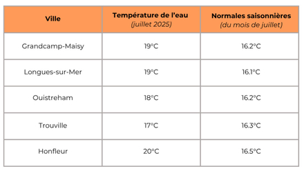 Température de l'eau pour le Calvados : aux alentours de 18,6 degrés en moyenne pour ce mois de juillet, contre une moyenne des normales saisonnières de 16,3°C.