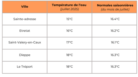 Température de l'eau pour la Seine-Maritime : aux alentours de 16,8 degrés en moyenne pour ce mois de juillet, légèrement supérieures à la moyenne des normales saisonnières de 16,3°C.