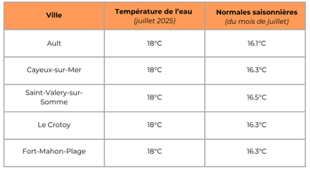 Température de l'eau pour la Somme : aux alentours de 18 degrés en moyenne pour ce mois de juillet, supérieures à la moyenne des normales saisonnières de 16,3°C.