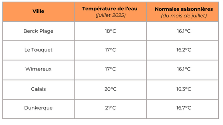 Température de l'eau pour le Pas de Calais : aux alentours de 18,6 degrés en moyenne pour ce mois de juillet, supérieures à la moyenne des normales saisonnières de 16,3°C.