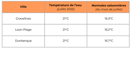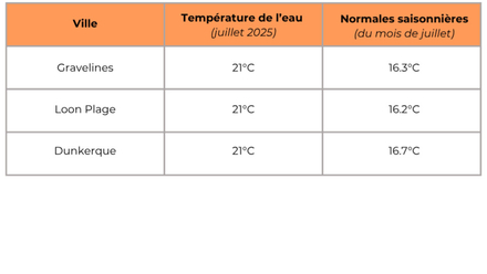 Température de l'eau pour le Pas de Calais : aux alentours de 21 degrés en moyenne pour ce mois de juillet, supérieures à la moyenne des normales saisonnières de 16,4°C.