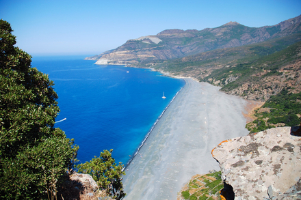 Ici, pas de sable blanc, mais des galets sombres aux reflets métalliques, issus des anciennes carrières d’amiante de la région. La plage de Nonza, spectaculaire et inhabituelle, s’étire en contrebas d’un pittoresque village perché sur les hauteurs. L’accès, plutôt raide, dissuade les plus pressés, mais le décor en vaut la peine : une mer profonde, un rivage insolite, et une atmosphère minérale qui tranche avec les clichés méditerranéens. Insolite, brute, saisissante.