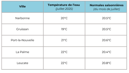 Température de l'eau pour l'Aude : aux alentours de 20,8 degrés en moyenne pour cette cinquième semaine, contre une moyenne des normales saisonnières de 20,6°C. Pour suivre l'évolution des prochains jours, rendez-vous sur METEO CONSULT Marine.
