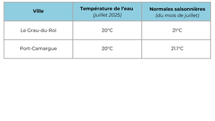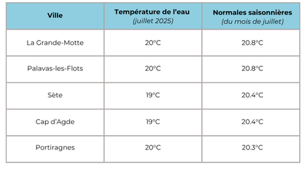 Avec un vent toujours présent, la mer reste très contrastée entre un est chaud et un ouest toujours perturbé. La baisse spectaculaire enregistrée sur les côtes du Languedoc et de Provence rappelle que les conditions estivales en Méditerranée ne sont jamais acquises. Si les vents faiblissent comme prévu d’ici la fin de semaine, une lente remontée des températures pourrait s’amorcer, juste avant le passage au mois d’août.