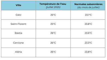Température de l'eau pour la Haute-Corse : aux alentours de 25,6 degrés en moyenne pour cette cinquième semaine, contre 23,5°C pour la moyenne des normales saisonnières. Pour suivre l'évolution des prochains jours, rendez-vous sur METEO CONSULT Marine.