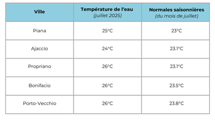 Température de l'eau pour la Corse-du-Sud : aux alentours de 25,4 degrés en moyenne pour cette cinquième semaine, contre une moyenne des normales saisonnières de 23,3°C. Pour suivre l'évolution des prochains jours, rendez-vous sur METEO CONSULT Marine.