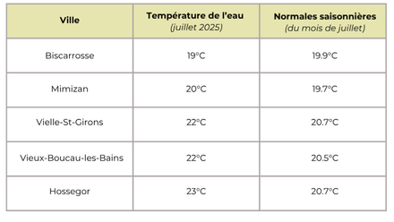 Température de l'eau pour les Landes : aux alentours de 21 degrés en moyenne cette semaine, contre une normale de 20,3°C. Pour suivre l'évolution des prochains jours, rendez-vous sur METEO CONSULT Marine.