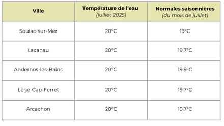 Température de l'eau pour la Gironde : aux alentours de 20 degrés en moyenne cette semaine, contre une normale saisonnière de 19,6°C. Pour suivre l'évolution des prochains jours, rendez-vous sur METEO CONSULT Marine.