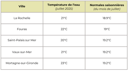 Température de l'eau pour la Charente-Maritime : aux alentours de 21,4 degrés en moyenne cette semaine, contre une normale saisonnière de 19,1°C. Pour suivre l'évolution des prochains jours, rendez-vous sur METEO CONSULT Marine.