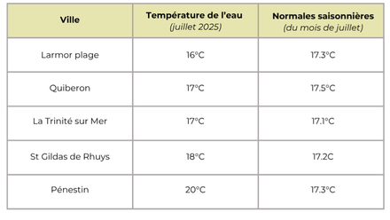 Température de l'eau pour le Morbihan : aux alentours de 17,6 degrés en moyenne cette semaine, contre une normale saisonnière de 17,3°C. Pour suivre l'évolution des prochains jours, rendez-vous sur METEO CONSULT Marine.