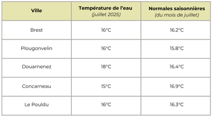 Température de l'eau pour le Finistère : aux alentours de 16,2 degrés en moyenne pour cette semaine, légèrement en-dessous de la normale saisonnière de 16,3°C. Pour suivre l'évolution des prochains jours, rendez-vous sur METEO CONSULT Marine.