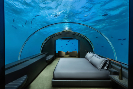 Première villa sous-marine, elle offre des services haut de gamme. Posée sur des pilotis, la villa est entourée et tournée vers l’immensité de l’océan. Sur le niveau supérieur, la villa toute blanche propose un grand salon, avec un coin repas et cuisine, le tout donnant sur une terrasse extérieure avec une piscine à débordement. En descendant l’escalier en colimaçon (ou en prenant l’ascenseur), on arrive dans une chambre aquarium. Un dôme en acrylique incurvé à 180 degrés permet d’avoir une vue complète sur l’océan et les poissons qui y nagent paisiblement. Dans la salle de bain ainsi que dans le dressing, de grandes baies vitrées permettent de continuer l’observation des profondeurs marines. Lors de votre séjour, il est possible d’organiser chaque jour une expérience, toujours en lien avec la mer, l’océan et la culture locale.