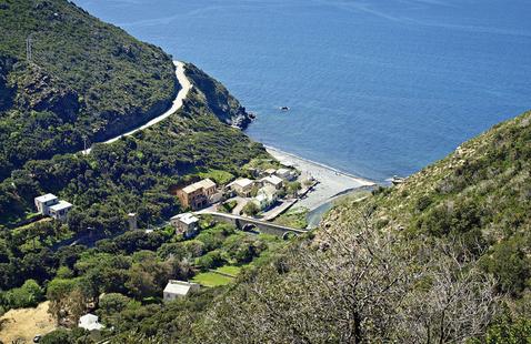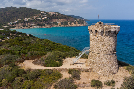 De l'autre côté, au sud de la pointe, la plage est plus confidentielle, plus calme, plus petite aussi (environ 150 m). Enserrée entre la presqu'île et une autre colline rocheuse à son extrémité sud, elle forme une petite crique, bien protégée des courants et des vents dominants ; c'est d'ailleurs un site de mouillage apprécié des plaisanciers (sauf par vents de secteur est). Par la terre, elle est accessible par un sentier, aménagé par le Conservatoire du littoral, en dix minutes de marche facile. En venant de Bastia, il faut dépasser la plage précédente ; le début du sentier se trouve juste après, à gauche à la sortie du virage (il est facilement repérable, une barrière en interdit l'accès aux voitures, il faut trouver à se garer sur le bas-côté). Après quelques minutes de marche, deux possibilités : prendre à droite pour rejoindre directement la plage, ou à gauche pour visiter la tour génoise. Construite au XVIe siècle, détruite par les Turcs au milieu du XVIIe siècle, restaurée au XXe (de 1988 à 1991), la tour fortifiée est inscrite au titre des Monuments Historiques depuis 1992. C'est l'une des rares tours génoises à deux étages encore présentes en Corse. La vue de toute part est magnifique depuis ses mâchicoulis. Et au départ de la plage, une très belle balade en snorkeling consiste à faire le tour de sa presqu'île et de l'îlot qui émerge à quelques mètres.