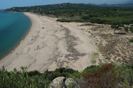 Dernière option : la très grande plage de Lavu Santu (le Lac Saint), située au sud de la crique précédente, dont elle est séparée par la colline. C'est un site beaucoup plus sauvage, davantage exposé aux éléments naturels. Bordée par l'étang de l'Ovu Santu (l'Œuf Saint), qui accueille une belle avifaune, des tortues Cistude et des crapauds verts, longue de 900 m, elle s'étend vers le sud jusqu'à l'embouchure de la rivière du Cavu, dont elle tire son sable grossier (à la différence des deux autres plages, constituée de sable fin de mer). Pavots, chardons bleus, immortelles d'Italie investissent joliment cet espace sauvage, partie intégrante des quelque 37 ha du site de Fautea protégés par le Conservatoire du littoral. Pour y accéder, il vous faudra là aussi vous garer sur le bas-côté de la nationale, au lieu-dit "La Parata", puis emprunter une piste caillouteuse (marche pas toujours aisée pour de jeunes enfants). Vous pouvez aussi y accéder depuis la plage précédente (la petite crique) ; il faut traverser la plage et, au niveau du grand pin, emprunter le sentier douanier à gauche de la colline (couverte de maquis à chênes-lièges) ; il vous mènera à son sommet pour ensuite redescendre sur la grande plage de Lavu Santu. Une petite balade d'une demi-heure.