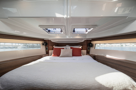 À l’intérieur, l’espace est optimisé pour la vie à bord. Les grandes baies vitrées apportent une belle luminosité et ouvrent largement la vue sur l’eau, donnant une impression d’espace agréable. Les deux cabines, chacune équipée d’une salle de bain privative, permettent d’accueillir jusqu’à cinq personnes dans un cadre fonctionnel et bien pensé. La literie a fait l’objet d’un soin particulier avec des matelas à mémoire de forme, et la cuisine, équipée d’un lave-vaisselle et d’une machine à café Nespresso®, assure une autonomie appréciable lors des escales. Le salon, moderne et épuré, est équipé d’une Smart TV, du Wi-Fi et du Bluetooth, offrant un certain confort pour les temps calmes à bord.