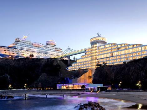 Premier arrêt en Corée du Sud, au nord-est du pays, situé dans la zone de Donghae Est Side Sea, célèbre pour ses nombreux sites naturels. Construit au début des années 2000 pour une ouverture en 2002, cet hôtel a été conçu à l’image d’un navire de croisière ; il mesure ainsi 165 mètres de long et 45 mètres de haut. Érigé au sommet d'une grande falaise, l'hôtel surplombe la mer et donne l'impression qu'un bateau de croisière s'est échoué. Un nouveau paquebot a été ajouté à l’hôtel, un peu plus bas, mais toujours sur la falaise. Aujourd’hui, l’hôtel compte 211 chambres, 2 restaurants, 2 piscines, ainsi que plusieurs lounges, une boîte de nuit et plusieurs bars. La situation de l’hôtel permet notamment de passer une journée à la plage ou encore de se rendre dans l’un des parcs d’attractions non loin. L’hôtel propose aussi des excursions en bateau (un vrai qui navigue) à la journée. Vous pouvez vous offrir une nuit dans cet hôtel si particulier à partir de 110€.