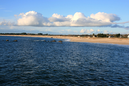 Véritable institution locale, la plage du Cap Coz s’avance dans la mer comme une longue langue de sable reliée à la côte par un cordon littoral. Très prisée des familles, elle séduit par ses eaux calmes et peu profondes, idéales pour la baignade. Sur plus de deux kilomètres, on peut alterner entre farniente au soleil, balades les pieds dans l’eau et activités nautiques, car le site abrite également une école de voile réputée. Depuis la plage, la vue s’étend vers la baie de Concarneau et l’archipel des Glénan au large, donnant à ce lieu une dimension presque méditerranéenne par la douceur de son atmosphère. À marée haute comme à marée basse, le Cap Coz garde son charme unique, entre station balnéaire familiale et paysage naturel préservé.