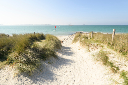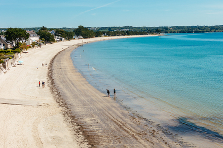 Cette plage familiale, lovée au fond d’une anse, séduit par son sable clair et sa pente douce qui rassure les baigneurs. Très fréquentée en été, elle garde une ambiance conviviale où les activités nautiques tiennent une grande place. Les voiles des dériveurs et catamarans y apportent des touches colorées, et les promeneurs profitent de la digue pour contempler la baie. C’est un lieu où se mêlent les générations, entre baignades, jeux de plage et instants de détente face à la mer.