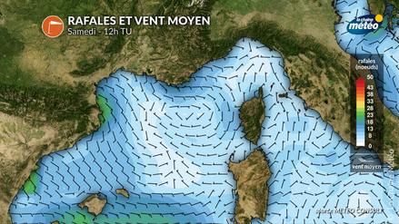 En mer, le vent tourne au sud-sud-ouest force 5, devenant ouest-sud-ouest ou nord-ouest force 3 à 4 selon les zones côtières. Les rafales atteindront 28 nœuds le matin. La mer devient agitée, surtout le soir. La houle est petite et assez longue, devenant modérée le soir. La prudence est recommandée, surtout pour les sorties en voilier.