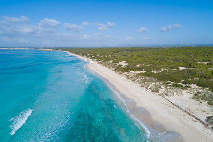 Avec ses quatre kilomètres de sable blanc et ses eaux cristallines, Es Trenc est sans doute la plage la plus connue de Majorque. Son décor épuré, presque caribéen, séduit autant les familles que les amateurs de longues balades au bord de l’eau. Préservée de la bétonisation, elle garde un esprit naturel rare sur l’île. Le contraste entre les dunes, les salines voisines et la mer turquoise en fait un lieu unique, où l’on vient pour la baignade autant que pour admirer un paysage encore préservé.