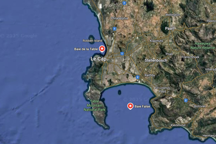 Au sud-est du Cap, False Bay forme une vaste baie semi-circulaire, beaucoup plus protégée que sa voisine. Elle s’étend de Cape Point à Hangklip, et abrite des villes côtières comme Simon’s Town, Fish Hoek, Muizenberg ou Gordon’s Bay. Orientée vers le sud-est, elle est bien abritée des vents du nord-ouest et des fortes houles de l’Atlantique.