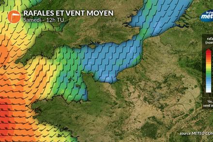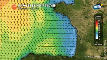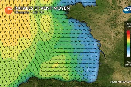 Dimanche, le temps se rafraichit nettement, mais des éclaircies reviennent pour aller à la plage avec des températures bien faibles de 13°C à 17°C. La température de l'eau reste agréable, autour de 17°C en général. Le ciel alterne entre larges éclaircies et passages nuageux, avec des averses possibles en fin de journée. La visibilité reste excellente. En mer, le vent de sud-ouest force 5 à 6 tourne au nord-est force 3 à 4, avec des rafales atteignant 40 nœuds le soir sur la Bretagne. La mer peu agitée devient agitée le soir. Les conditions sont plus favorables pour la voile, mais restez vigilant face aux rafales.
