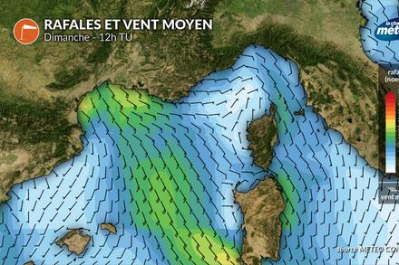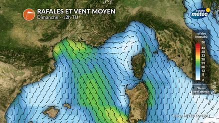 Dimanche, il fait beau sur l'est du bassin tandis que le vent marin fraîchit avec l'arrivée des orages en Occitanie. Les températures grimpent jusqu'à 29°C aux Bouches de Bonifacio. Le ciel devient très nuageux avec des risques d'orages, notamment de Cerbère à Port Camargue. Des averses avec possibilité de rafales sont attendues. La visibilité est médiocre à excellente, réduite par la brume au bord du golfe du Lion.