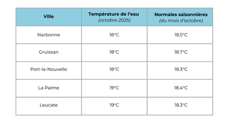 Température de l’eau pour l’Hérault : aux alentours de 18.2 degrés en moyenne pour le mois d’octobre 2025, légèrement inférieurs aux normales saisonnières de 18.7°C.