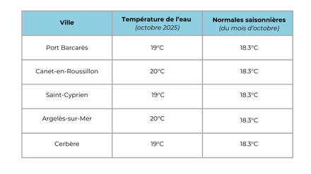 Température de l’eau pour les Pyrénées-Orientales : aux alentours de 19.4°C en octobre 2025, soit plus d’un degré au-dessus des normales de 18.3°C.