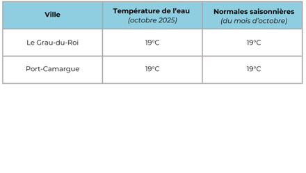 Température de l’eau pour le Gard : aux alentours de 19 degrés en moyenne pour le mois d’octobre 2025, contre une moyenne des normales saisonnières de 19°C.
