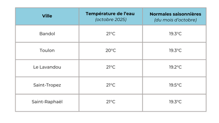 Température de l’eau pour le Var : aux alentours de 20.8 degrés en moyenne pour le mois d’octobre 2025, supérieurs aux normales saisonnières de 19.3°C.