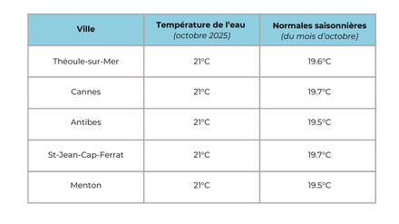 Température de l’eau pour les Alpes-Maritimes : aux alentours de 21 degrés en moyenne pour le mois d’octobre 2025, supérieurs aux normales saisonnières de 19.6°C.