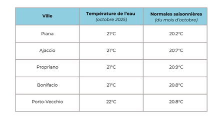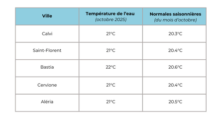 Température de l’eau pour la Haute-Corse : aux alentours de 21.2 degrés en moyenne pour le mois d’octobre 2025, légèrement supérieurs aux normales saisonnières de 20.4°C.