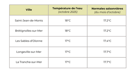 Température de l’eau pour la Vendée : aux alentours de 17.4 degrés en moyenne pour le mois d’octobre 2025, conformes aux normales saisonnières de 17.4°C.