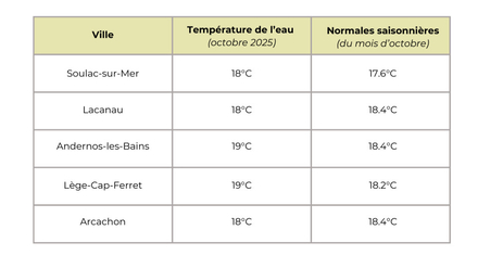 Température de l’eau pour la Gironde : aux alentours de 18.6 degrés en moyenne pour le mois d’octobre 2025, légèrement supérieurs aux normales saisonnières de 18.2°C.