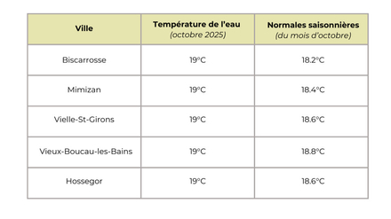 Température de l’eau pour les Landes : aux alentours de 19 degrés en moyenne pour le mois d’octobre 2025, supérieurs aux normales saisonnières de 18.5°C.