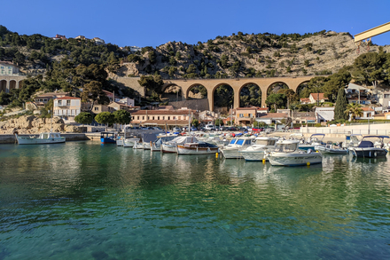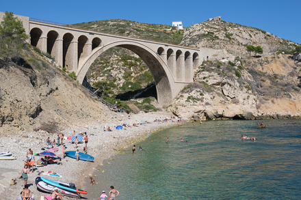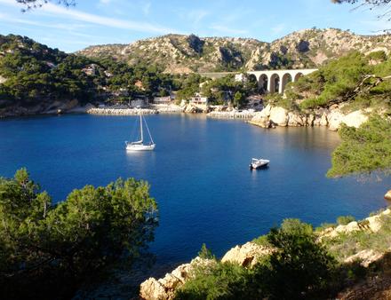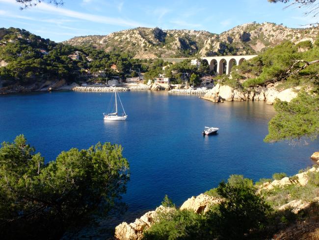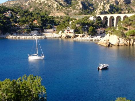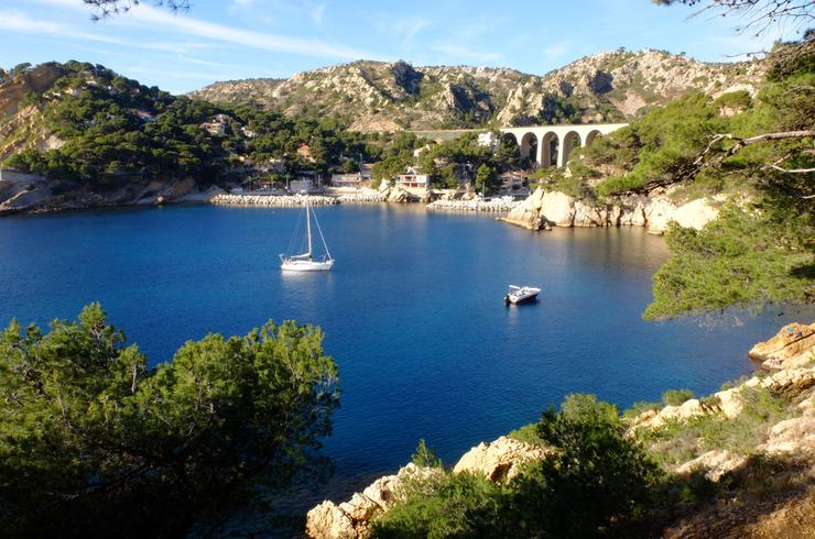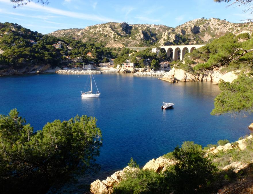En direction de Carry-le-Rouet, la calanque des Eaux Salées mérite le détour. Cachée sous son viaduc centenaire, classé monument historique, elle s’étend entre falaises calcaires et pinède clairsemée.