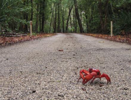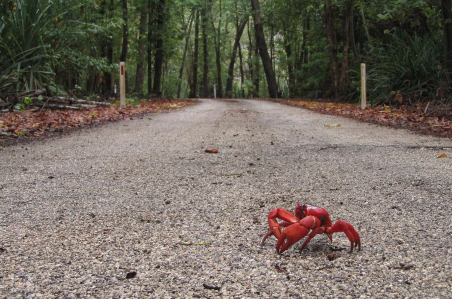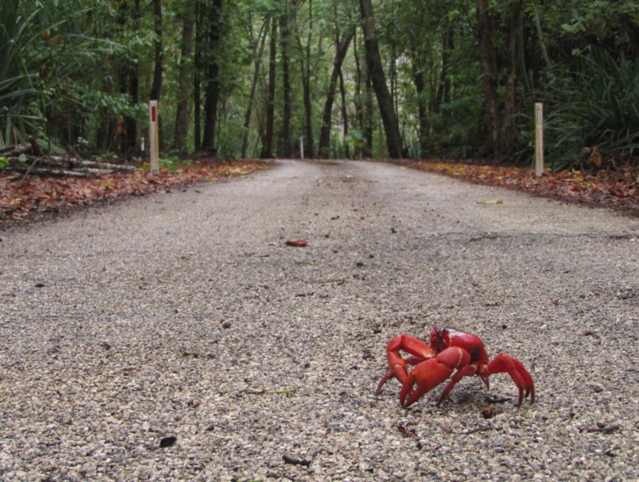 Dès le mois d’octobre, les crabes rouges terrestres (Gecarcoidea natalis) quittent la forêt tropicale pour gagner la mer. En quelques jours, les chemins, les routes et même les habitations sont recouverts d’un tapis rouge en mouvement. Selon les biologistes du Christmas Island National Park, près de 40 à 50 millions d’individus participent à cette migration spectaculaire.