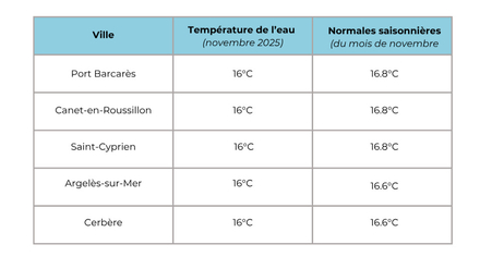 Température de l’eau pour les Pyrénées-Orientales : aux alentours de 16°C en novembre 2025, contre une moyenne de normales saisonnières de 16.7°C.